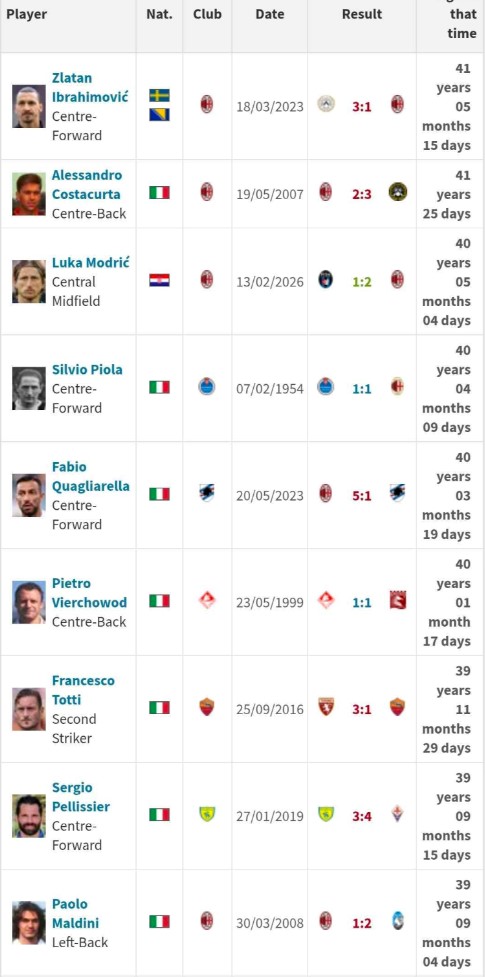 Jedina dvojica starijih strijelaca od Modrića su isto tako bivši igrači Milana, Zlatan Ibrahimović te Alessandro Costacurta. Ibrahimović je svoj zadnji gol u Serie A zabio kada je imao 41 godinu, pet mjeseci i 15 dana, dok je Costacurta zabio s 41 godinu i 25 dana. Zbog toga, Modrić više ne može ove sezone stići nijednog od njih dvojice.
