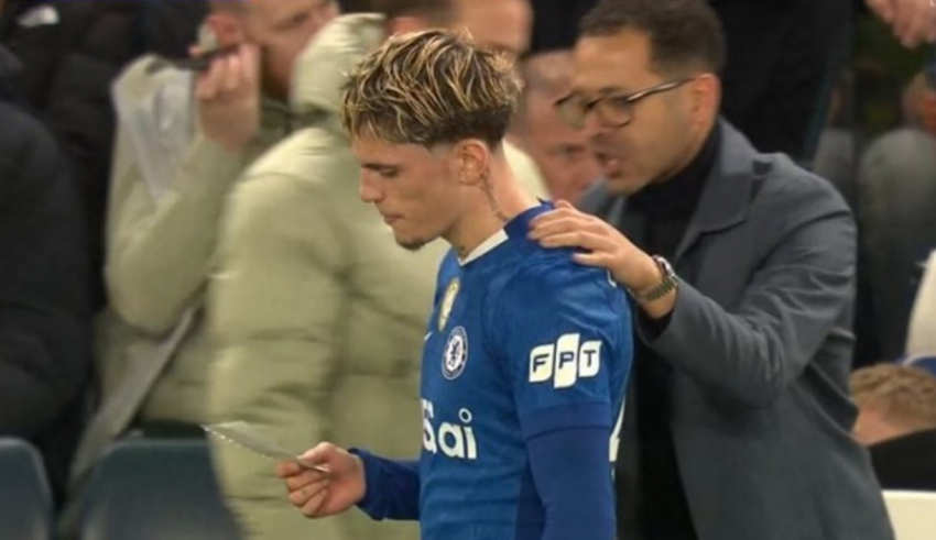 Nakon toga, Rosenior mu uručuje papirić s taktičkim uputama, koje Garnacho prima s vidljivom sumnjom na licu, i zatim ga nosi preko terena saigraču Tosinu Adarabioyu.