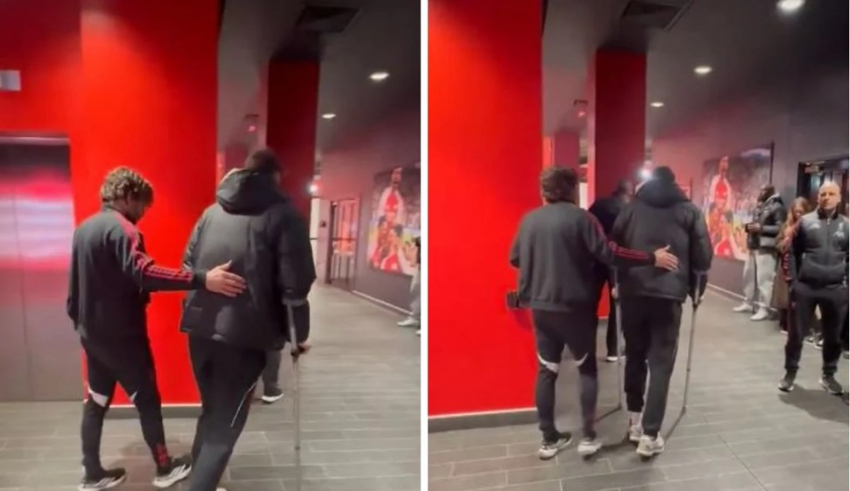 ‼️ Conor Bradley abandona el Emirates Stadium en muletas y con una protección en la rodilla.